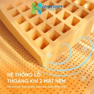 • Thiết kế 1 bề mặt hơn 5000 lỗ tròn phía trên và 1 bề mặt hơn 500 lỗ vuông phía dưới, giúp thông khí lưu thông liên tục giúp người nằm có cảm giác mát mẻ tự nhiên rất thoải mái
