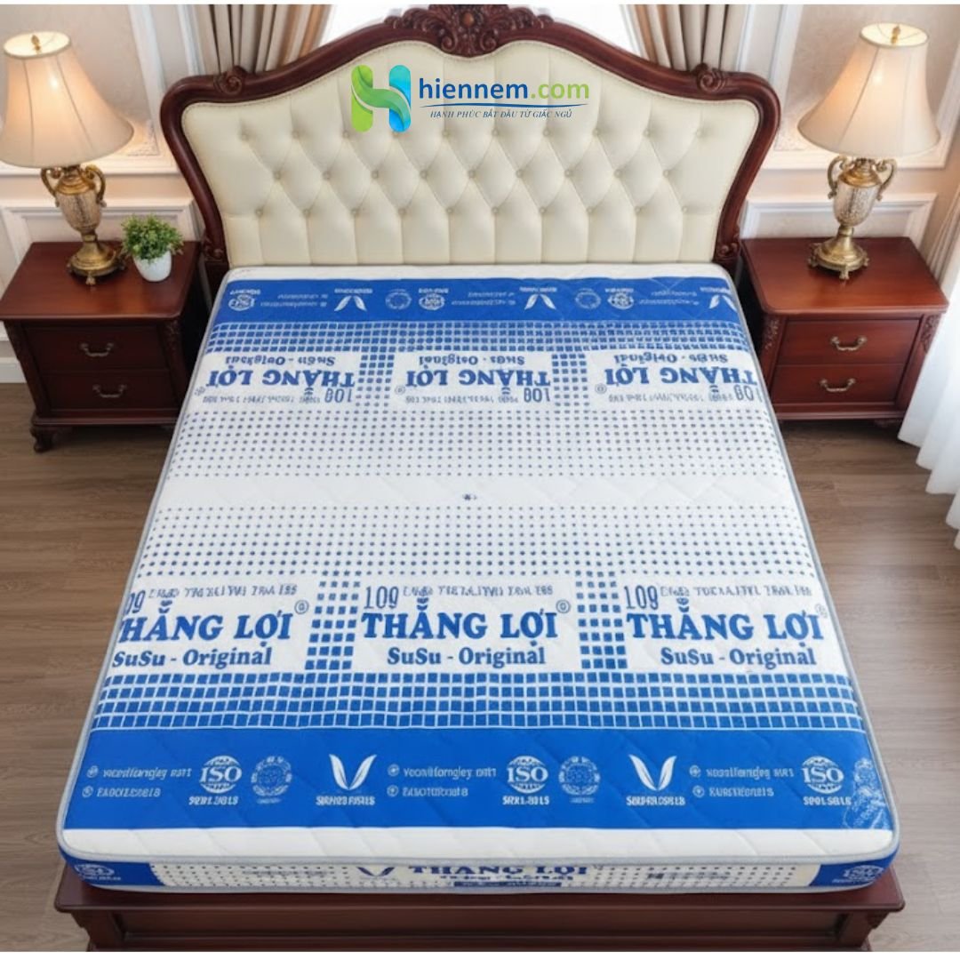 Nệm 100% Cao Su Thiên Nhiên Thắng Lợi SuSu – Original là lựa chọn lý tưởng cho ai muốn cải thiện giấc ngủ một cách tự nhiên, an toàn và bền lâu. Được làm từ mủ cao su nguyên chất Tây Nguyên, nệm không pha hóa chất độc hại, đàn hồi vượt trội, nâng đỡ chuẩn 7 vùng cơ thể và hỗ trợ giảm đau lưng – đau vai gáy hiệu quả.