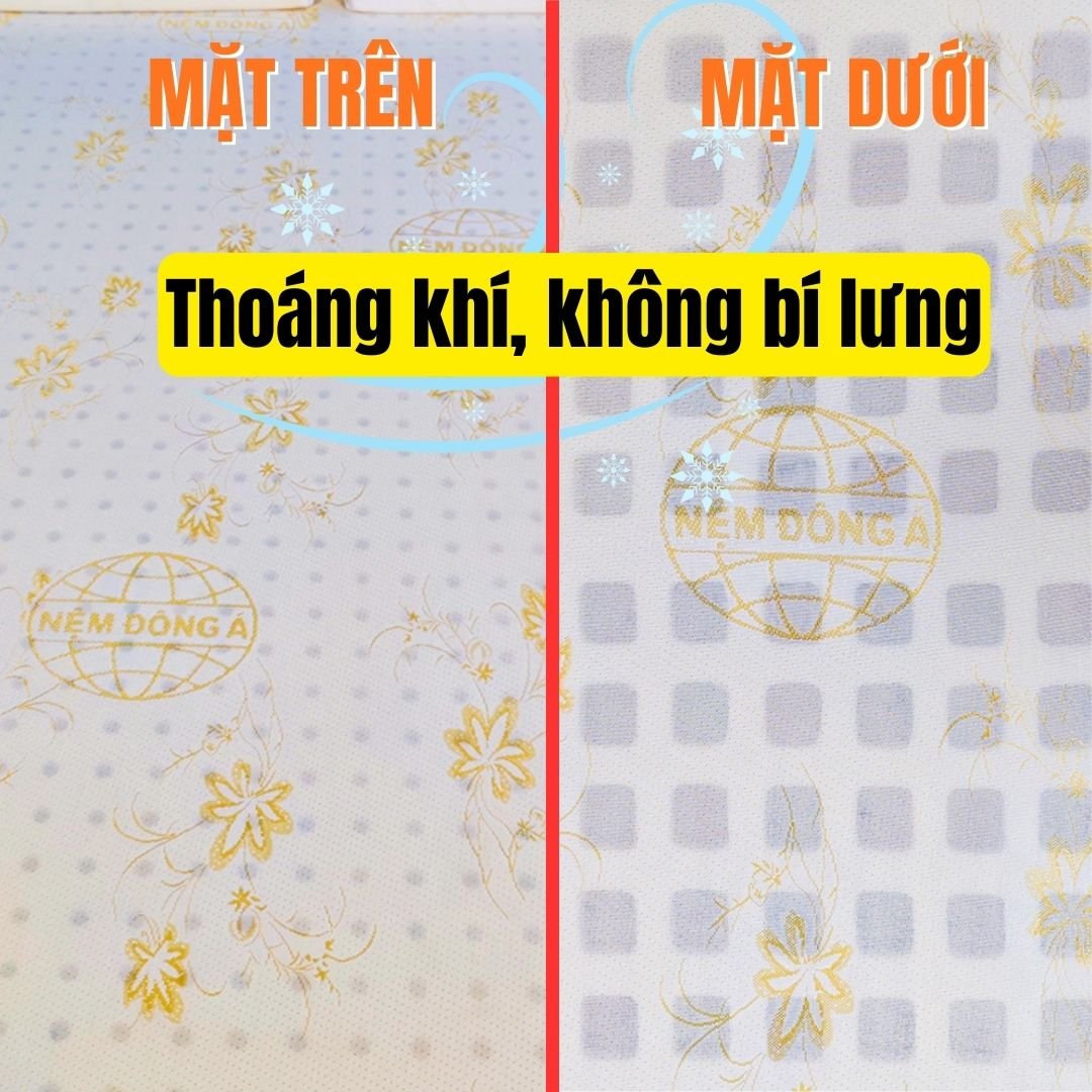 - Cấu trúc bọt khí và khuôn đúc đặc biệt tạo nên 5000 lỗ tròn mặt trên và 500 lỗ vuông ở mặt dưới giúp nệm thông thoáng tối đa.